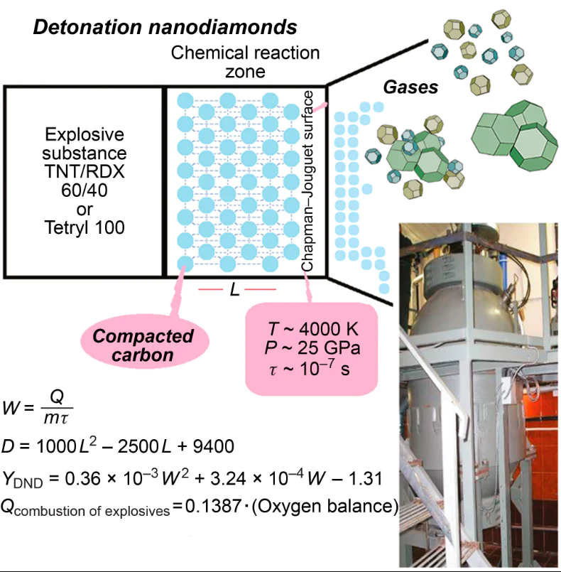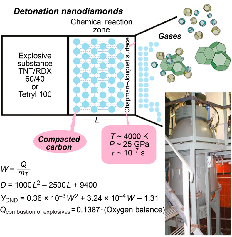 In the presence of this great number of significant factors, it is clear that indication of just the same composition of explosives in different studies cannot guarantee the same yield of nanodiamonds. Moreover, the main explosion parameters for the same explosives with charges of the same density do not guarantee identical detonation velocity, pressure in the Chapman – Jouguet plane, lifetime, length (width) of the chemical reaction zone, and DND yield. These values are affected not only by the skills of the performers, but also by the availability of equipment.