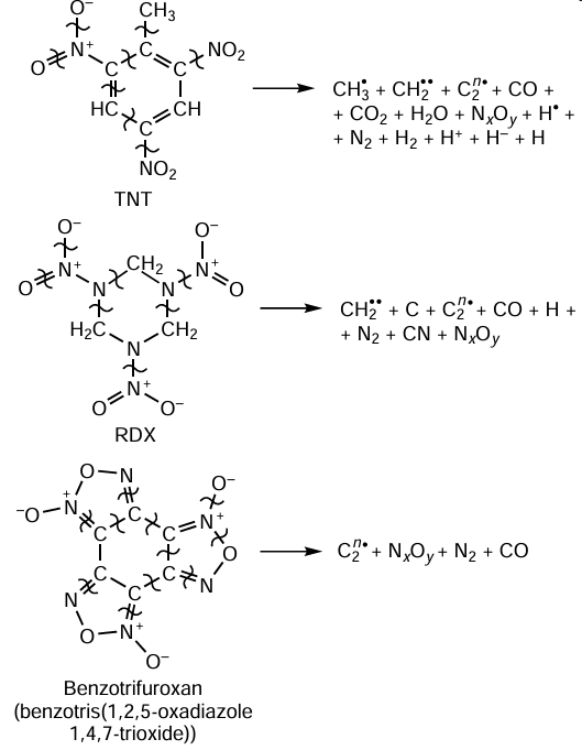The decomposition of explosive molecules corresponding to three classes of organic compounds is depicted in Scheme 1.[19]
