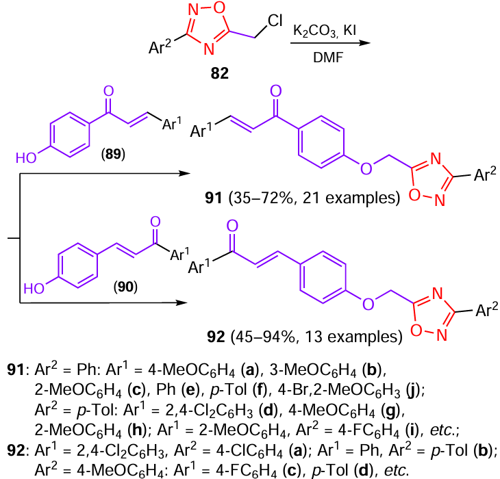 One more type of hybrid structures capable of acting as nematicidal agents combined 1,2,4-oxadiazole ring with a chalcone moiety.[47] According to early studies,[52] chalcone derivatives possess certain nematicidal activity. The chosen chalcones 89 and 90 were prepared by aldol condensation of benzaldehydes and acetophenones (Scheme 17). They were subjected to nucleophilic substitution reaction with chloroethyl 1,2,4-oxadiazole derivative 82 to give target compounds 91 and 92.