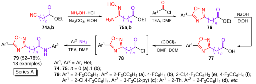 A similar synthetic approach was used to obtain three series (A – C) of 1,2,4-oxadiazole derivatives based on tioxazafen with high structural flexibility.[46] To this end, ethyl cyanoformates 74a,b were treated with hydroxylamine to give amidoximes 75a,b, which were then allowed to react with various aroyl chlorides in the presence of triethylamine. The resulting 1,2,4-oxadiazoles 76 were hydrolyzed to carboxylic acids 77, which were converted to acyl chlorides 78 on treatment with oxalyl chloride. Compounds 78 reacted in situ with primary amines to form compounds 79 belonging to series A (Scheme 15). Intermediate compounds 74 – 77 were isolated by procedures reported by Liu et al.[48] and Voronova et al.;[49] however, the yields of products were not indicated.