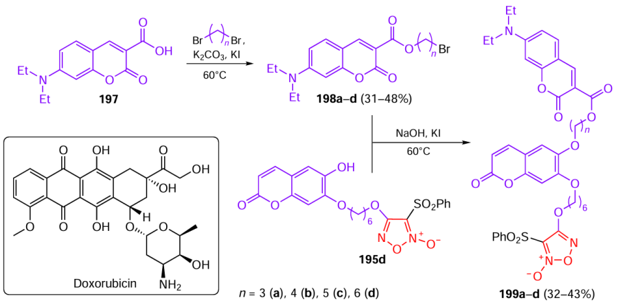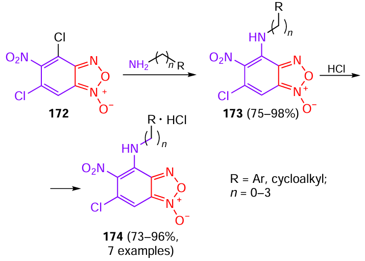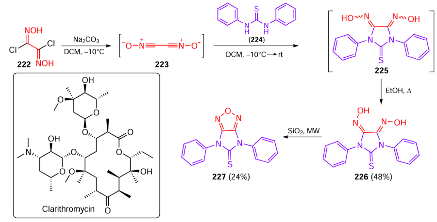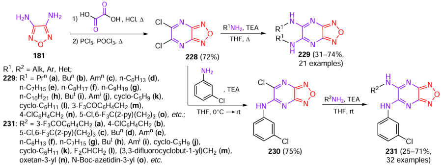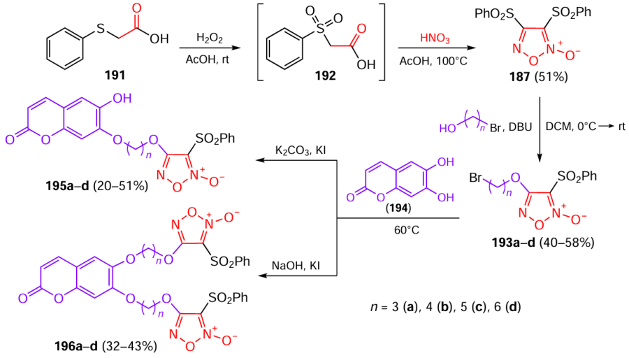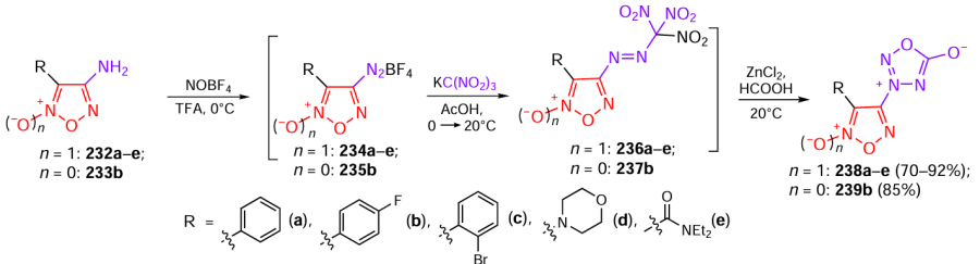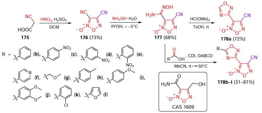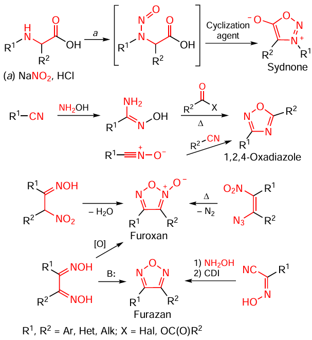 The major synthetic routes for the assembly of the heterocyclic cores for sydnones and sydnonimines,[7] 1,2,4-oxadiazoles,[8] 1,2,5-oxadiazoles (furazans), and their N-oxides (furoxans)[9] have been well studied. The heterocyclization reactions giving oxadiazoles used most commonly in synthetic practice are summarized in Scheme 1. The most popular method for the closure of the sydnone heterocyclic ring is the nitrosation of amino acid derivatives followed by cyclization. 1,2,4-Oxadiazoles are prepared by two standard synthetic routes, with nitriles being used as key substrates in both cases. The first method is based on the addition of hydroxylamine to the starting nitrile followed by cyclocondensation of the resulting amidoxime via the reaction with carboxylic acid anhydrides or chlorides or their synthetic equivalents. An alternative method consists in the use of nitriles as dipolarophiles in the 1,3-dipolar cycloaddition to nitrile oxides. The chemistry of 1,2,5-oxadiazoles is more diverse. There are three frequently used methods for the furoxan synthesis: oxidation of dioximes (glyoximes), dehydration of α-nitrooximes, and thermally induced elimination of molecular nitrogen in the cyclization of α-nitroazides. Under the action of bases, glyoximes are cyclodehydrated to give furazans; aminofurazans can also be prepared by treating cyanoxime with hydroxylamine followed by cyclodehydration in the presence of carbonyldiimidazole (CDI).