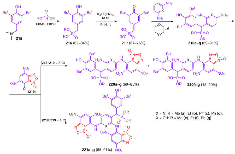 For compounds 133a – e and 134a – e, free radical scavenging experiments were carried out by UV absorption analysis using DPPH. A solution of ascorbic acid in ethanol served as a positive control. The best DPPH scavenging capability was found for derivatives 133c,b,d,e (Table 11); other compounds were inactive (EC50 > 200 μM). Thus, bis-N-oxides have higher antioxidant activity than similar mono-N-oxides.