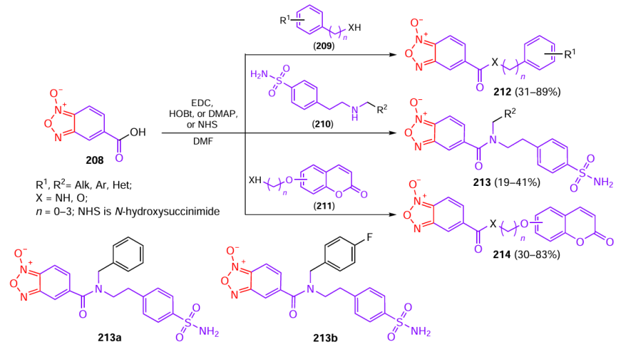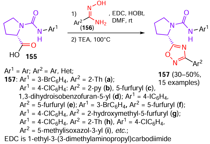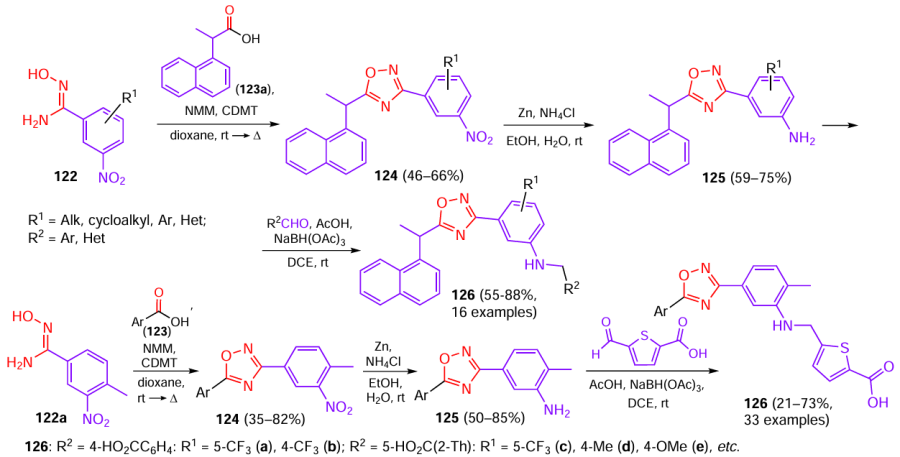 The 1,2,4-oxadiazole moiety was formed via the conventional cyclization of aromatic amidoximes 122 with carboxylic acids 123 (Scheme 23).[71] The carboxyl groups of acids 123 were preactivated by binding to 2-chloro-4,6-dimethyloxy-1,3,5-triazine (CDMT) in the presence of NMM in dioxane at room temperature. The intermediate esters were treated with nitroaromatic amidoximes 122 to form the corresponding 1,2,4-oxadiazoles 124, which were reduced with zinc and ammonium chloride to aminoaryl-1,2,4-oxadiazoles 125. The target compounds 126 were obtained by reductive amination of 125 with aldehydes in the presence of sodium triacetoxyborohydride in DCE at room temperature. Products 126 derived from amidoxime 122a (R1 = 4-Me) with participation of thiophene-2,5-dicarbaldehyde at the final step have a peripheral thiophenecarboxylic acid moiety complementary to a binding site of protease. 1,2,4-Oxadiazoles 126f,g, containing a biphenyl and carbazole instead of the naphthyl moiety, were synthesized using a similar sequence of transformations.