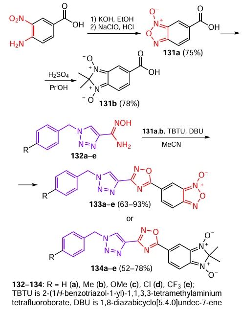 Studies of the antioxidant activity of heterocyclic compounds, especially with the aim of modulating the ROS generation processes, provide data for correlations with anticancer, anti-inflammatory, and even antimicrobial activity.[37][72][73] Mayer et al.[73] collected these data for (1,2,3-triazolyl)-1,2,4-oxadiazole systems. The condensation/cyclodehydration reaction sequence involving benzofuroxanyl- (131a) and dimethylbenzimidazolecarboxylic acid dioxide (131b) and substituted benzyl(1,2,3-triazolyl)carbamidoximes 132a – e resulted in the synthesis of target products 133a – e, 134a – e (Scheme 25).
