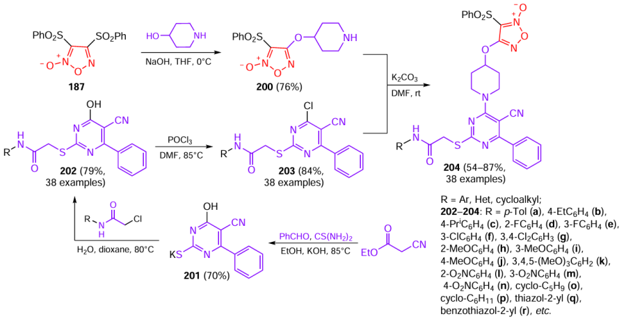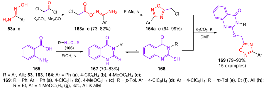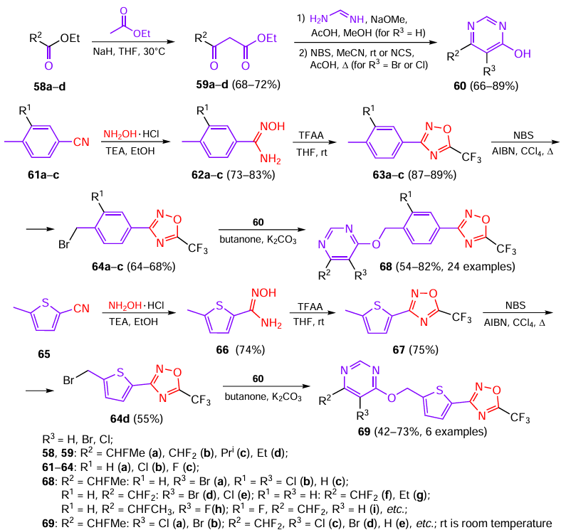 Liu et al.[41] prepared a series of pyrimidine ethers containing trifluoromethyl-1,2,4-oxadiazole, a structural moiety known for the ability to inhibit histone deacetylase and thus be useful for the treatment of rust on plants. Pyrimidinols and trifluoromethyl-1,2,4-oxadiazoles prepared via two- and three-step transformations, respectively, served as the key reactants (Scheme 13). In the first step, esters 58a – d were condensed with ethyl acetate in the presence of sodium hydride in THF. Cyclization of the resulting keto esters 59a – d with formamide afforded pyrimidinols 60. In some cases, the pyrimidine ring was additionally halogenated with N-bromo- (NBS) or N-chloro-succinimide (NCS). For the synthesis of trifluoromethyl-1,2,4-oxadiazoles, first, hydroxylamine was added to substituted aromatic nitriles 61a – c, then the resulting amidoximes 62a – c were cyclized on treatment with trifluoroacetic anhydride, and 1,2,4-oxadiazoles 63a – c and 67 thus formed were subjected to radical bromination of the methyl group with NBS in the presence of azobis(isobutyronitrile) (AIBN) as an initiator. At the final step, bromomethyl-1,2,4-oxadiazoles 64a–d underwent the nucleophilic substitution reaction with pyrimidinols 60 in the presence of potassium carbonate. A similar sequence of reactions was performed for 2-thienylnitrile 65, with amidoxime 66 and 1,2,4-oxadiazole 67 being isolated in intermediate steps. Finally, target products 68 and 69 were obtained.
