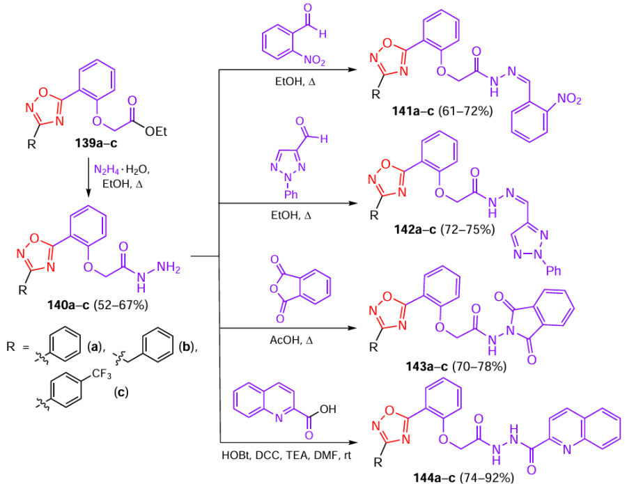Among isomeric oxadiazole structures, pharmacologically oriented 1,3,4-oxadiazoles are among the longest known and best studied compounds. The recent works in this area were summarized in reviews published in 2018 and 2024.[10][11] However, the latest results on the synthesis and pharmacological studies of 1,2,3-, 1,2,4-, and 1,2,5-oxadiazoles have not been systematized, and data on these derivatives are fragmentary. Therefore, the present review summarizes the most recent achievements in the targeted synthesis of lead compounds based on oxadiazole derivatives with the N – O bond in the ring and discusses their pharmacologically relevant properties. Whenever possible, data on the possible mechanism of action of 1,2,3-, 1,2,4-, and 1,2,5-oxadiazoles as applied to a particular experimentally proven type of biological activity are given.