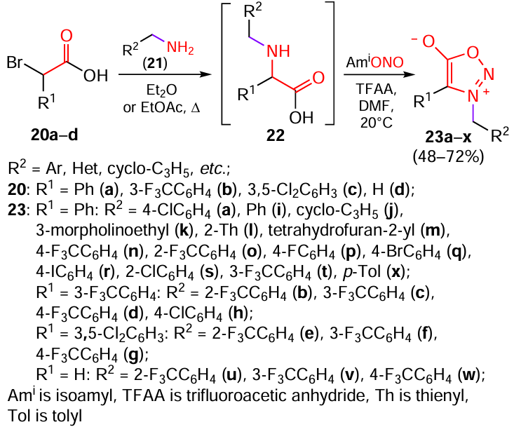 Owing to the discovery and commercialization of the insecticide triflumezopyrim,[22] the trend towards investigation of mesoionic compounds in the development of fungicides and insecticides has taken shape in the last decade.[23][24] Using a two-step one-pot procedure, Du et al.[25] prepared sydnonimines that had a good potential for the use in agriculture (Scheme 5). The first step of the synthesis consisted in the substitution of bromine atoms in acids 20a – d by amines 21, which readily proceeded on refluxing in diethyl ether or ethyl acetate. In the second step, nitrosation of the secondary amino group in compounds 22 was performed by treatment with isoamyl nitrite and trifluoroacetic anhydride, while the subsequent cyclization resulted in the target sydnones 23a – x.