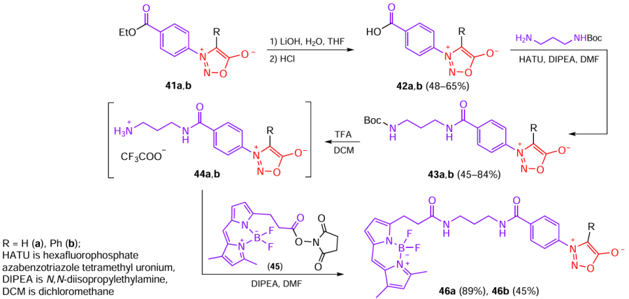Mitochondria are considered to be a promising target for cancer diagnosis and therapy. In recent years, mesoionic biorthogonal reagents, which include sydnones, have been used for cell labelling and drug delivery.[31] For example, Xu et al.[32] investigated the ability of fluorophore sydnones based on BODIPY (4,4-difluoro-4-bora-3a,4a-diaza-s-indacene) to act on mitochondria. These conjugates were synthesized from mesoionic compounds 41a,b in four steps (Scheme 10). First, esters 41a,b were hydrolyzed under mild conditions to acids 42a,b, which were then allowed to react with N-Boc-1,3‑diaminopropane (Boc is tert-butoxycarbonyl) to give compounds 43a,b. The Boc deprotection occurred on treatment with trifluoroacetic acid (TFA) through the formation of intermediates 44a,b. Finally, the reaction of compounds 44a,b with N-succinimide derivative BODIPY-NHS (45) in the presence of the Höing base (N,N-diisoropylethylamine) afforded the desired fluorophore conjugates 46a,b.