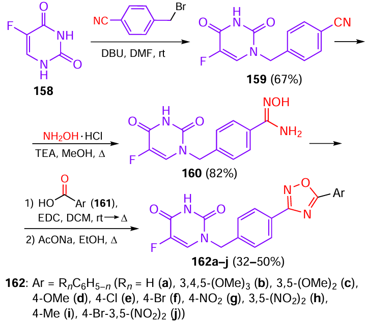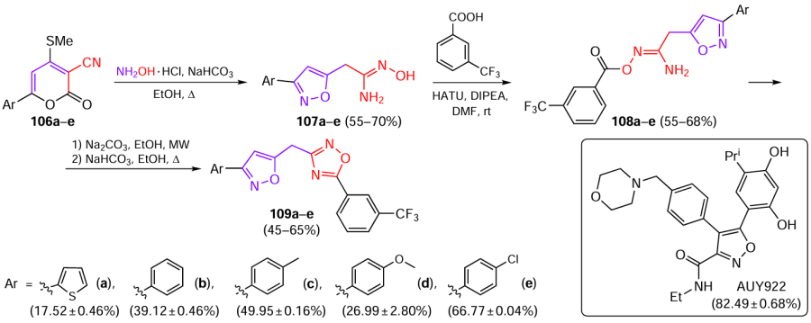 In 2022, Kumar Kushwaha et al.[64] proposed a new synthetic approach to 3-isoxazolylmethyl(1,2,4-oxadiazole) derivative exhibiting activity against human immunodeficiency virus (HIV) (Scheme 21; the values in parentheses indicated under the structures are HIV-1 inhibition rates).[64] The starting pyran-3-carbonitriles 106a – e were obtained in one step by condensation of α-aroylketene dithioacetals with malononitrile, which was described in detail in earlier publications of this research group.[65][66] On treatment with hydroxylamine under mild basic conditions, pyrans 106a – e undergo heterocyclic ring opening followed by isoxazole ring closure, and the subsequent addition of the second hydroxylamine molecule affords amidoximes 107a – e. The intermediate amidoximes 107a – e were functionalized with a 3-trifluoromethylbenzoyl group in the presence of HATU, which was followed by microwave-assisted intramolecular cyclization to form final 1,2,4-oxadiazoles 109a – e. In the original publication,[64] the authors postulated acylation of the amino group in amidoximes 107; however, it seems more correct to consider intermediates 108 as O-acylated derivatives.