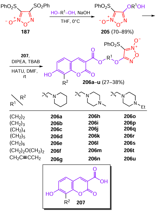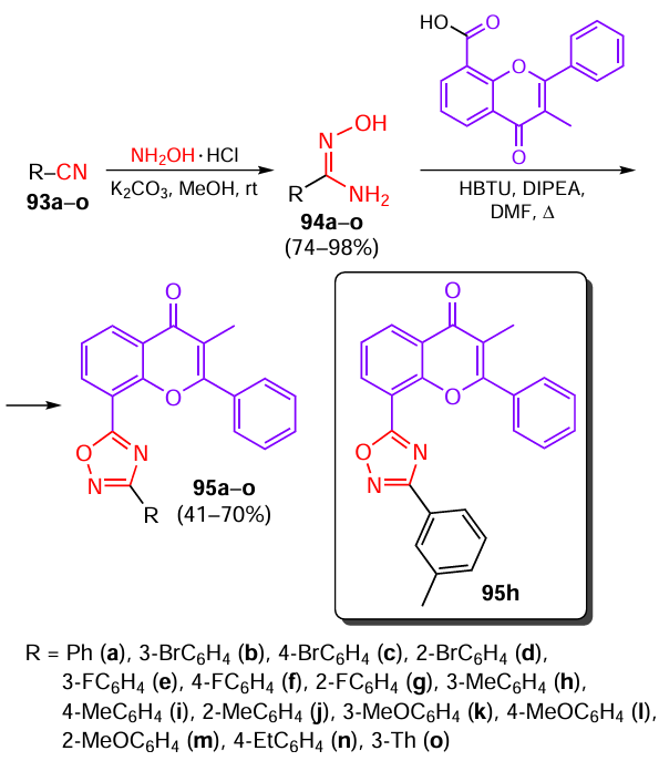 1,2,4-Oxadiazoles are well-known pharmacophores with a clear-cut therapeutic effect in inflammatory processes,[53] which allows them to be used for the treatment of Parkinson’s disease (PD).[54][55] The combination of a 1,2,4-oxadiazole ring and a flavonoid natural skeleton known to possess anti-inflammatory,[56] antioxidant, and neuroprotective properties[57] in a single molecule produced compounds with potential activity against PD.[58] The 1,2,4-oxadiazole ring was synthesized from nitrile derivatives using a standard two-step approach (Scheme 18). In the first step, nitriles 93a – o were converted to amidoximes 94a – o, which were introduced in one-pot cyclization with methyloxophenyl-4H-chromenecarboxylic acid using hexafluorophosphate benzotriazoletetramethyluronium (HBTU) as a coupling reagent and a Hünig’s base to give flavone derivatives 95a – o substituted at C(8).