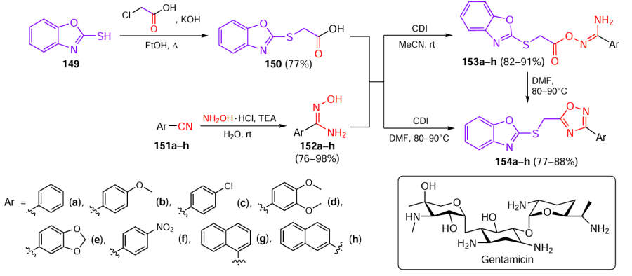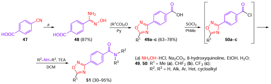 In an attempt to find new compounds with fungicidal activity that could become drug candidates, a series of various amides containing the 1,2,4-oxadiazole moiety was synthesized [39] (Scheme 11). 4-Cyanobenzoic acid 47 reacted with hydroxylamine in the presence of 8-hydroxyquinoline, used as a chelating agent to decrease the fraction of the undesirable benzamide by-product, to afford 4-carboxybenzamidoxime 48, which was then O-acylated and cyclized in the presence of the appropriate anhydride and pyridine (Py). Treatment of 4-(1,2,4-oxadiazolyl)benzoic acids 49a – c with thionyl chloride yielded chlorides 50a – c, which were subsequently allowed to react with secondary amines.