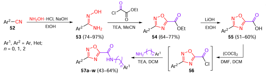Liu et al.,[40] who addressed 1,2,4-oxadiazole amides (Scheme 12) possessing antifungal properties, described the reaction of various (hetero)aromatic nitriles 52 with hydroxylamine. This gave amidoximes 53, which were then treated with ethyl oxalyl chloride in acetonitrile. Then esters 54 were hydrolyzed with LiOH in ethanol to give acids 55. Compounds 55 reacted with oxalyl chloride to give acid chlorides 56, which were converted to target amides 57a – w by the reaction with primary amines (Table 4).