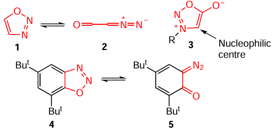 Unlike other isomers, unsubstituted 1,2,3-oxadiazole (1) is unstable and exists mainly as a tautomeric linear diazoketone, formyldiazomethane (2). A derivative with an exocyclic oxygen atom, 1,2,3-oxadiazol-5-one (sydnone) 3, which is a mesoionic heterocycle with spatially separated positive and negative charges, is used much more often (Scheme 2). However, the introduction of fused benzene rings or other electron-donating aromatic substituents may stabilize the 1,2,3-oxadiazole structure in the gas phase.[12] It was shown that some substituted benzannulated 1,2,3-oxadiazoles are in equilibrium with open-chain tautomers.[13] The relative equilibrium concentration of the components strongly depends on the solvent and degree of substitution: the diazoketone structure is stabilized by hydrogen bonds and polar interactions. Of the two compounds, 5,7-di-tert-butyl-1,2,3-benzoxadiazole (4) is more stable: it is 6.3 kJ mol–1 energetically more favourable in the gas phase than the valence isomer, diazocyclohexadienone 5. As regards the reactivity profile of sydnones, the C(4) atom of the heterocycle is the nucleophilic centre, providing the possibility of electrophilic functionalization. In the case of 3,5-disubstituted 1,2,3-oxadiazoles, the C(4) atom bears a relatively acidic hydrogen atom and can be deprotonated on treatment with strong organolithium bases.[7][14]