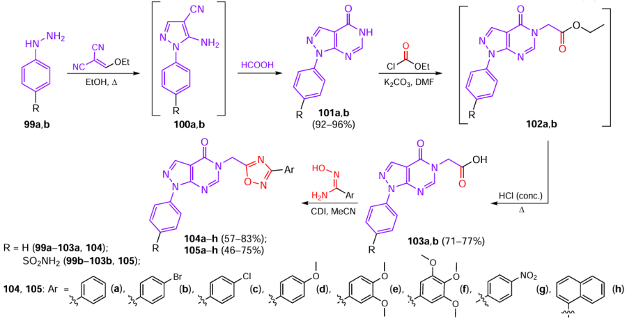 Combining pyrazolo[3,4-d]pyrimidine moiety known for anti-inflammatory activity [60-62] with the 1,2,4-oxadiazole ring resulted in the formation of hybrids exhibiting synergistic properties.[63] The one-pot two-step preparation of intermediate pyrazolo[3,4-d]pyrimidines was the key to the synthesis of the target products (Scheme 20). 2-Ethoxymethylenemalononitrile was reacted with phenylhydrazines 99a,b, and the aminocyanopyrazoles 100a,b thus formed were heated in formic acid. This induced pyrimidine ring closure and afforded products 101a,b, which were then N-alkylated with ethyl chloroacetate in the presence of anhydrous potassium carbonate. Ethyl esters 102a,b were not isolated, but were subjected in situ to acid hydrolysis with concentrated hydrochloric acid. The carbonyl group of the resulting acids 103a,b was activated with CDI and subjected to heterocyclization with amidoximes to afford target 1,2,4-oxadiazoles 104a – h and 105a – h.