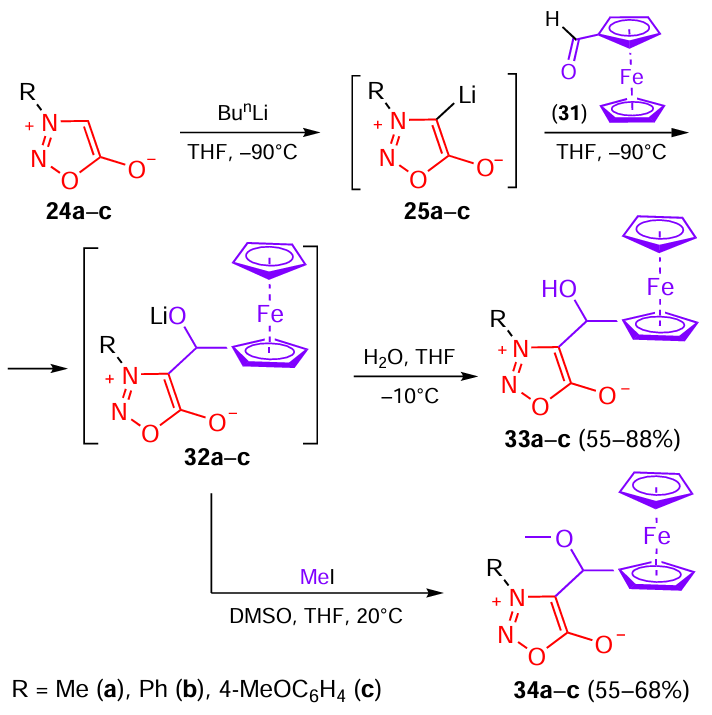Similarly, Kalganova et al.[27] investigated the properties of 4-[α-hydr(alk)oxy]ferrocenylmethyl sydnone derivatives (Scheme 7). As in the above study,[26] sydnones 24a – c were first converted to lithium intermediates 31a – c, which reacted with ferrocenecarbaldehyde to give intermediate lithium alkoxides 32a – c. Acidification of the reaction mixture furnished the target 4-(α-hydroxy)ferrocenylsydnones 33a – c, while treatment of ferrocene-containing alkoxides 32a – c with iodomethane gave methoxy derivatives 34a – c.