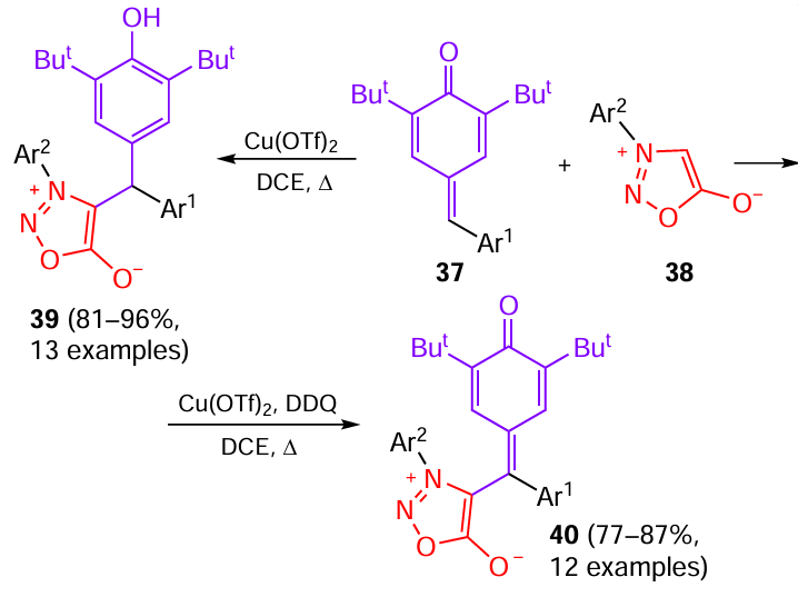 Due to the mesoionic nature of sydnones and unique distribution of charge density over the heterocycle, these compounds exhibit a substantial antioxidant activity.[29] Serrao et al.[30] reported the first study of the 1,6-addition and oxidative C – H functionalization reactions carried out between p-quinonemethylides 37 and sydnones 38 in the presence of catalytic amounts of copper(II) trifluoromethanesulfonate (triflate, TfO). When 20 mol.% Cu(OTf)2 was used and the reaction was carried out by refluxing in 1,2-dichloroethane (DCE), substituted pheno – sydnone hybrids 39a – m were obtained When an oxidant, 2,3-dichloro-5,6-dicyano-1,4-benzoquinone (DDQ), was added to the system, oxidative C – C coupling of substrates 37 and 38 took place, resulting in the formation of products 40a – l in good yields (Scheme 9).