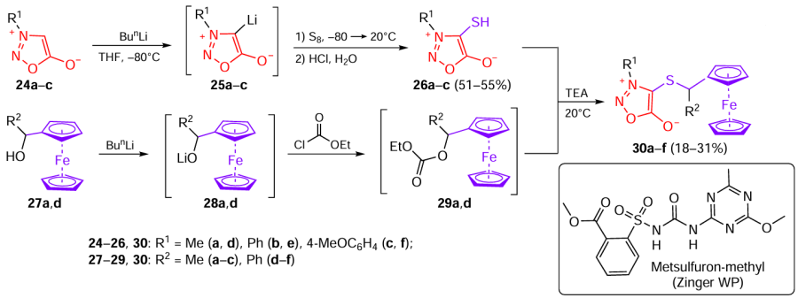 A few publications of the past five years have been devoted to the development of ferrocene derivatives of sydnones and the study of their antidote activity against the metsulfuron-methyl herbicide (alternatively called Zinger WP). In particular, Shevaldina et al.[26] investigated the ferrocenylalkylation of 4-sulfanylsydnones (Scheme 6). The starting sydnones 24a – c were deprotonted on treatment with BunLi; then the resulting lithium intermediates 25a – c were allowed to react with elemental sulfur to give thiols 26a – c in moderate yields. Ferrocene was incorporated into the molecule via alkylation: ferrocene-containing secondary alcohols 27a,d were treated with n-butyllithium to give lithium alkoxides 28a,d. Upon acylation with ethyl chloroformate, these compounds were converted to intermediates 29a,d, which reacted with sulfanylsydnones 26 in the presence of triethylamine (TEA) to give 4-(ferrocenylalkylthio)sydnones 30a – f.