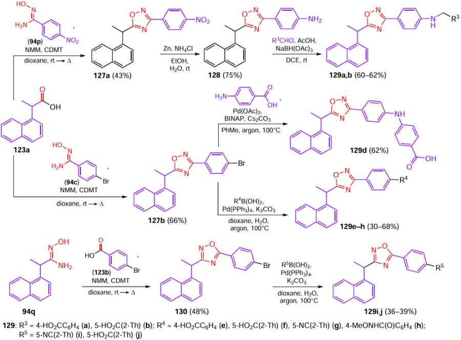 Aromatic amidoximes 94c,p,q and acids 123a,b were used as the starting reactants, being converted first to intermediates 127 and 128 and then to 1,2,4-oxadiazoles 129a – j (Scheme 24). The brominated intermediates 127b and 130 differ by the positions of substituents at the C(3) and C(5) atoms of the 1,2,4-oxadiazole ring: the former was prepared from p-bromophenyl amidoxime 94c, while in the synthetic pathway to compound 130, a para-bromine atom was present in carboxylic acid 123b. Subsequently, these aryl bromides were subjected to the Suzuki reaction with aromatic boronic acids, yielding compounds 129e–j, while the new C – N bond in product 129d was generated via a cross-coupling reaction with p-aminobenzoic acid.