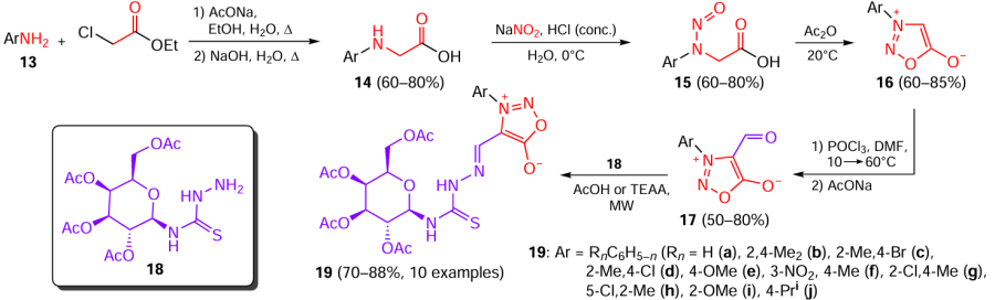 Substituted anilines 13 were converted to the corresponding aldehydes in five steps. First, substituted glycines 14 were obtained by the reaction of 13 with ethyl chloroacetate followed by alkaline hydrolysis. Nitrosation of compounds 14 and cyclization of the resulting N-nitroso derivatives 15 in the presence of acetic anhydride yielded 3-arylsydnones 16. The subsequent Vilsmeier – Haack formylation of sydnones 16 furnished 3-aryl-substituted 4-formylsydnones 17. These aldehydes were subjected to microwave (MW)-assisted condensation with N-(D-galactopyranosyl)thiosemicarbazide[21] (18) catalyzed by glacial acetic acid or 2-hydroxyethylammonium acetate (TEAA), resulting in the formation of conjugates 19 (Scheme 4). The use of ionic liquid provided advantages, including shorter reaction time and increased yield of the target product.[17]