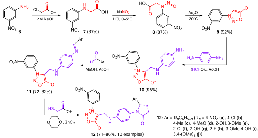 For example, Savant et al.[16] combined sydnone, Mannich base, and 4-thiazolidone moieties in one molecule with the goal to enhance the antimicrobial activity. In the first step, m-nitroaniline 6 was alkylated with chloroacetic acid in the presence of 2 M NaOH. Nitrosation of the resulting amino acid 7 followed by cyclization of intermediate nitrosocarboxylic acid 8 on treatment with acetic anhydride gave m-nitrophenylsydnone 9. Subsequently, compound 9 was aminomethylated by treatment with paraformaldehyde and p-phenylenediamine to afford sydnone 10, which was then condensed at the free amino group in the aromatic ring with substituted benzaldehydes in the presence of glacial acetic acid. The formed Schiff bases 11 were treated with thioglycolic acid in the presence of anhydrous zinc chloride as a Lewis acid, which resulted in the formation of 4-thiazolidones 12 in high yields (Scheme 3).