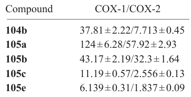 (1,2,4-Oxadiazolyl)pyrazolo[3,4-d]pyrimidine derivatives 104a – h and 105a – h were investigated for the inhibitory effect in vitro against COX-1, COX-2, and 5-LOX and for the ability to inhibit NO release, in order to evaluate the anti-inflammatory potential of the products. Most of the compounds showed the inhibitory activity at a micromolar level, while sulfamides 105a – h mainly exhibited selectivity to COX-2 with the following IC50 values (M):