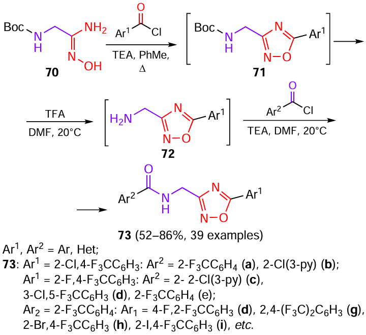 Another study[45] devoted to the search for new nematicidal agents was focused on the structural modification of fluopyram. The flexible ethyl group connecting the amide and pyridine moieties was replaced by structurally rigid 1,2,4-oxadiazole ring. For this purpose, a one-pot method was developed, which included the cyclization of amidoxime 70 with benzoyl chlorides followed by removal of the tert-butoxycarbonyl protecting group in intermediates 71. This gave intermediates 72 with a free amino group, which were acylated in situ to afford the target compounds 73 (Scheme 14).