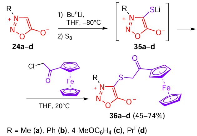 Similar studies were carried out for α-thio-substituted acetylferrocenes containing a sydnone moiety at the sulfur atom (Scheme 8).[28] C(4)-unsubstituted sydnones 24a – d were first treated with n-butyllithium, and the lithium intermediates were treated with elemental sulfur to give lithium thiolates 35a – d. These thiolates are good nucleophiles and are easily alkylated with the corresponding chloroacetylferrocene derivative. This reaction is general and is successfully implemented for both 3-alkyl- and 3-aryl-substituted sydnones 36a – d.