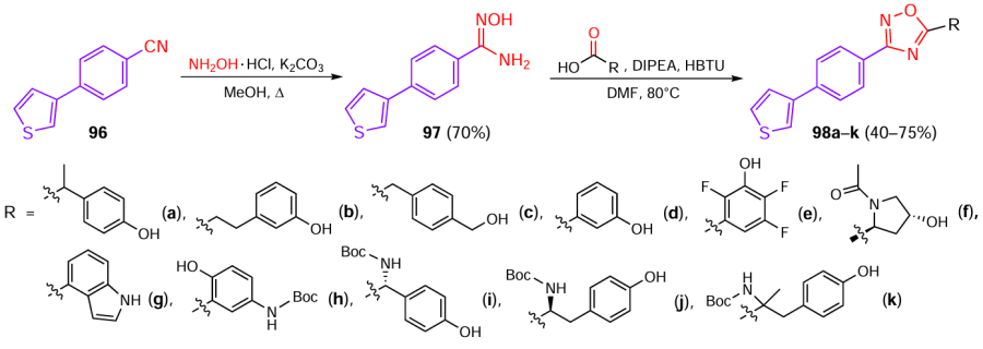 Multiple inhibition of the biological targets involved in the biosynthesis of anti-inflammatory eicosanoids represents an innovative strategy for treating inflammatory diseases because of its higher efficacy and safety.[59] Potenza et al.[53] described 1,2,4-oxadiazole-based inhibitors of eicosanoid biosynthesis. The synthesis was performed according to a standard two-step protocol (Scheme 19): aromatic nitrile 96 was allowed to react with hydroxylamine, and the resulting amidoxime 97 was subjected to cyclization with various carboxylic acids in the presence of HBTU and DIPEA, which gave products 98a – k. Compounds 98h – k contained Boc-protected amino groups; the subsequent deprotection was performed by treatment with trifluoroacetic acid in dichloromethane.