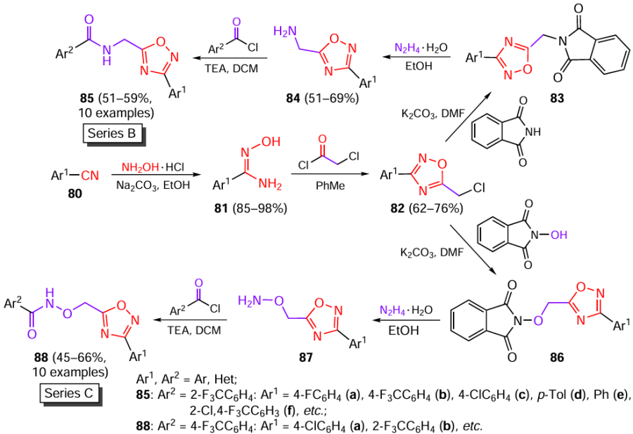 The pharmacologically oriented compounds of series B and C were synthesized starting from substituted benzonitriles 80, which were converted to amidoximes 81, and this was followed by the heterocyclization with chloroacetyl chloride[50] (Scheme 16). Using procedures reported by Ölmez and Waseer,[51] the resulting 5-chloromethyl-1,2,4-oxadiazoles 82 were treated with phthalimides. In the case of phthalimide with a free NH group, this gave derivatives 83, which were treated with hydrazine hydrate to obtain free primary amines 84, while the subsequent reaction with acyl chlorides furnished target compounds 85 (series B). A similar sequence of reactions for N-hydroxyphthalimide involved the intermediate formation of compounds 86 and 87 and resulted in the formation of 1,2,4-oxadiazoles 88 (series C). The yields of intermediates 82, 86, and 87 were not reported in the original publication.