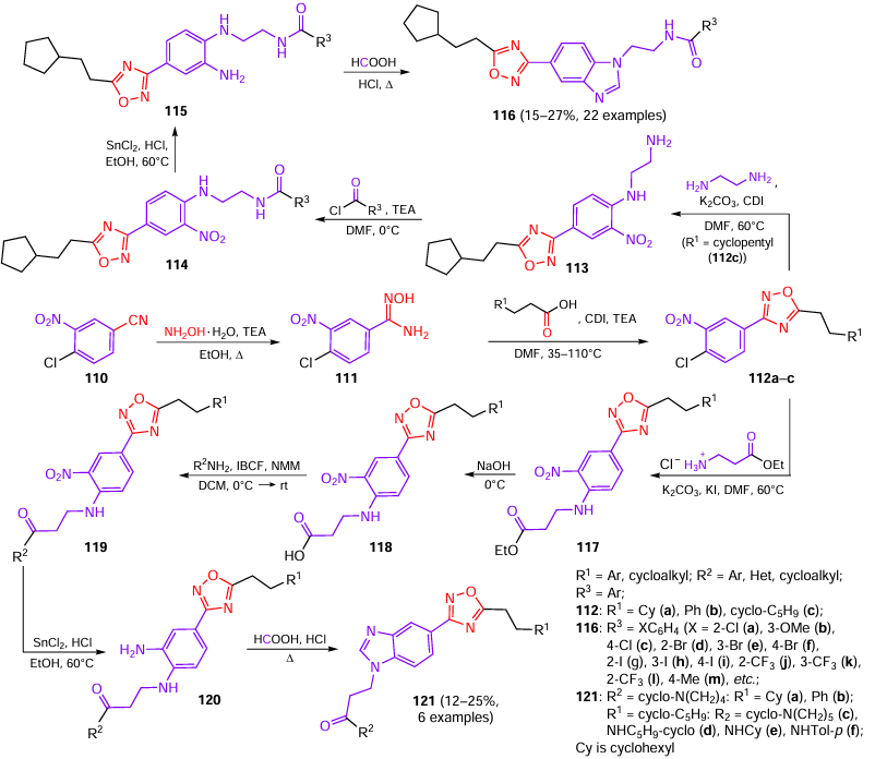 Next, two series of compounds were obtained. The synthetic protocol for the first series of target products began from intermediate compounds 112c. 1,2,4-Oxadiazole 112c reacted with ethylenediamine to give amine 113, which was then acylated to give amides 114. After reduction of the nitro group in these compounds with stannous chloride, the o-phenylenediamine derivatives 115 were subjected to cyclization with formic acid to obtain the target compounds.