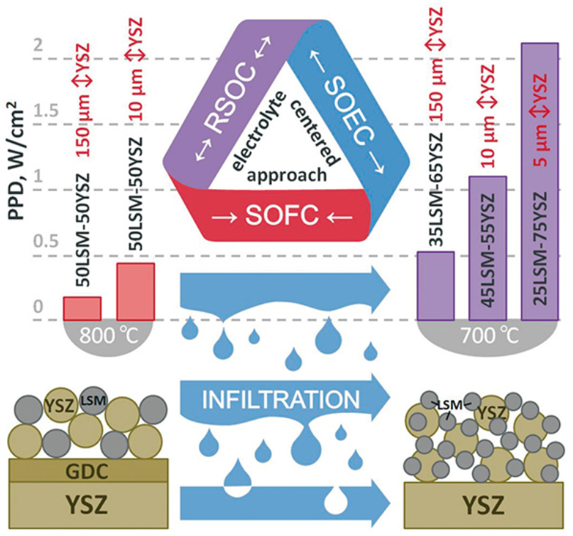 Infiltration enables the fabrication of nanocomposite electrodes using various state-of-the-art electrode materials and oxide promoters with excellent catalytic properties. These materials cannot be applied directly to the ZrO2-based electrolyte due to thermomechanical or chemical incompatibility. Furthermore, the amount of catalyst can be significantly reduced compared to conventional composite electrodes, making it cost-effective. Special attention is given to the combined infiltration of buffer material followed by the loading of a perovskite catalyst to increase cell performance and durability and prevent nanoparticle coarsening.