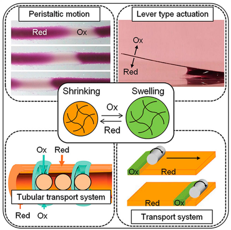 Further development of works in the field of self-oscillating gels for the design of transport systems resulted in the design of a tube-shaped peristaltic pump system (Fig. 22).[114] This system mimicked functioning of living systems such as blood vessels and the intestines.