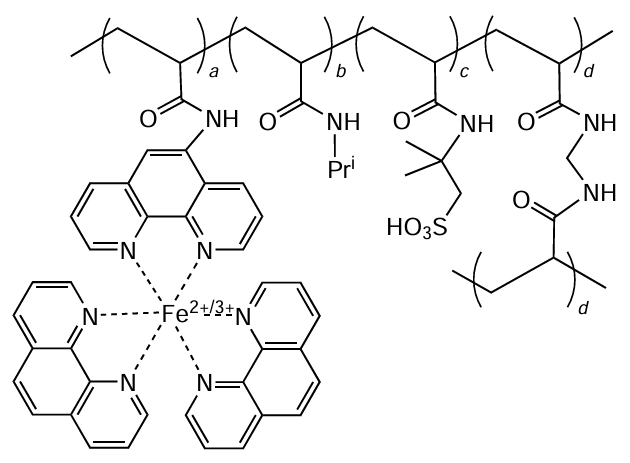 In 2012, T.Arimura and M.Mukai[80] developed self-oscillating gel 7 (Fig. 6), which was similar to gel 1 in composition, but instead of catalytically active ruthenium complex, it contained ferroin catalyst (5-acrylamido-1,10-phenanthroline)bis(1,10-phenanthroline)iron(II) [Fe(acphen)(phen)2] covalently bound to the polymer matrix. This gel was synthesized by copolymerization of Fe(acphen)(phen)2 with IPAAm and MBAAm using AIBN as an initiator.