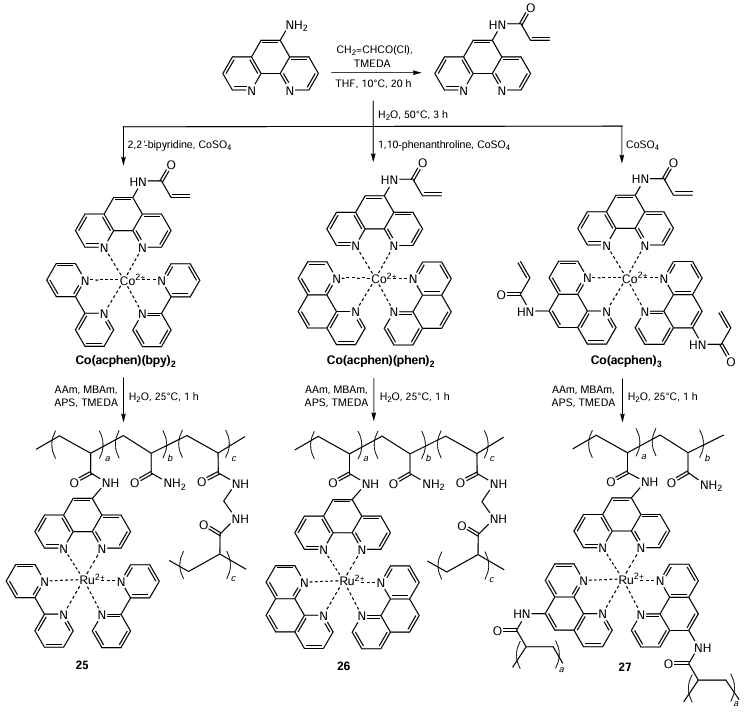 As a rule, researchers that develop and study self-oscillating gels use only catalytically active ruthenium or iron complexes for immobilization in the gels in which these complexes serve as a sort of chemical engines for the appearance of chemomechanical oscillations. In this regard, of particular interest is the study by Mallphanov et al.,[97] who synthesized the first self-oscillating gels based on cobalt complexes. Using (5-acrylamido-1,10-phenanthroline)bis(2,2'-bipyridine)cobalt(II) [Co(acphen)(bpy)2], (5-acrylamido-1,10-phenanthroline)bis(1,10-phenanthroline)cobalt(II) [Co(acphen)(phen)2], and tris(5-acrylamido-1,10-phenanthroline)cobalt(II) [Co(acphen)3], the authors synthesized gels 25, 26, and 27 (Scheme 2), correspondingly. Gels 25 and 26 were prepared by copolymerization of Co(acphen)(bpy)22+ or Co(acphen)(phen)22+ with AAm and MBAAm, which acted as a cross-linker. Gel 27 was obtained by copolymerization of Co(acphen)32+ with only AAm, since the complex acted simultaneously as a catalyst and as a cross-linker. The APS – TMEDA redox system was used to initiate polymerization.