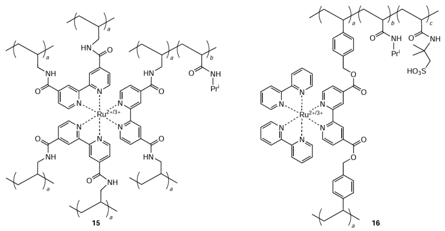 Aizenberg et al.[93] synthesized cross-linked gel 16 using ruthenium(II) bis(2,2'-bipyridine)[bis(4-vinylbenzyl)[2,2'-bipyridine]-4,4'-dicarboxylate] [Ru(vbnbpy)(bpy)2] as the cross-linker. The gel was obtained by photopolymerization of a solution of Ru(vbnbpy)(bpy)2, IPAAm, and AMPS in DMSO using 2-hydroxy-2-methyl-1-phenyl-1-propanone (Darocur 1173) as the photoinitiator. The quantitative ratios of the components in the gel and the testing conditions in a CFBZ solution are given at the end of Section 3. The BZ reaction initiated in the gel gave rise to chemomechanical oscillations with a period of 51 s and a change in the diameter by 20%. Like other gels based on poly(N-isopropylacrylamide), gel 16 swelled during oxidation of the catalyst and deswelled during the catalyst reduction.