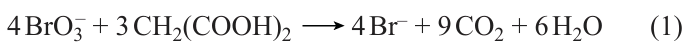 Since autonomous self-oscillating chemomechanical gels are cross-linked polymers with immobilized BZ reaction catalysts and the periodic changes in their size are mainly due to periodic redox transitions of the catalyst, the chemical reactions giving rise to chemomechanical oscillations can be represented as shown in Fig. 1.