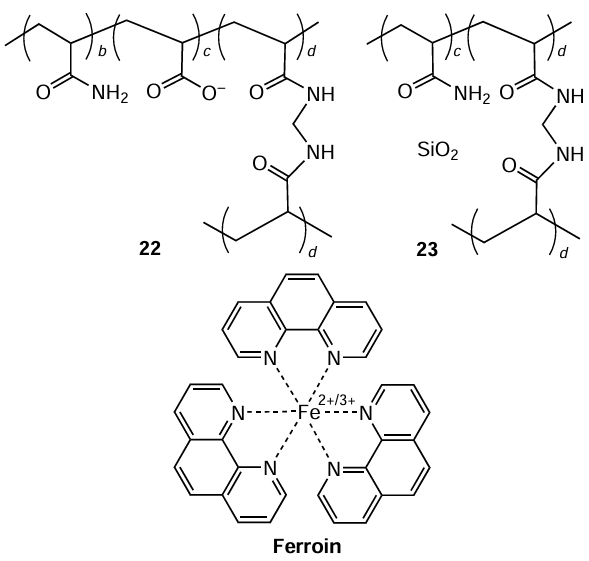 The authors[67][68] designed the cross-linked poly[acrylamide-co-acrylate-co-N,N'-methylenebis(acrylamide)] gel (gel 22) and the composite of poly(acrylamide-co-N,N'-methylenebis(acrylamide)] with silica gel (gel 23). Gel 22 was synthesized in an aqueous medium by free radical copolymerization of sodium acrylate with acrylamide (AAm) and MBAAm. Composite gel 23 was obtained by free radical polymerization of AAm in water in the presence of Na2SiO3 and MBAAm. The APS – TMEDA redox system was used to initiate polymerization. After impregnation with ferroin [Fe(phen)32+] and immersion into a CFBZ solution, the gels showed chemomechanical oscillations (up to 15%): they shrank during ferroin oxidation and swelled during ferroin reduction.