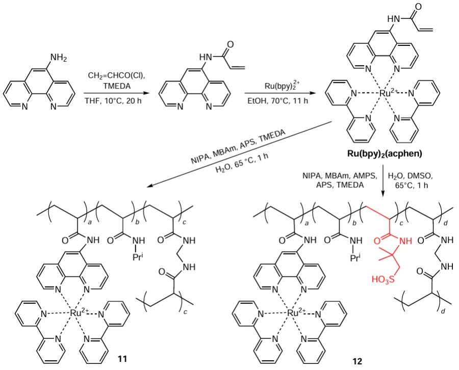An interesting approach was proposed by Sato et al.,[85] who synthesized an autonomous self-oscillating chemomechanical gel 9 in several steps (Fig. 9). First, copolymerization of IPAAm and APMAAm gave a linear copolymer, poly(IPAAm-co-APMAAm), and then Ru(bpy)3-NHS was grafted to some of the amino groups. The resulting poly[IPAAm-co-APMAAm-co-APMAAm-Ru(bpy)3-NHS] was cross-linked at the residual amino groups by the poly(IPAAm-co-N-acryloxysuccinimide) copolymer functioning as a cross-linker. The quantitative ratios of the components in the gels and the testing conditions in a CFBZ solution are given at the end of Section 3.