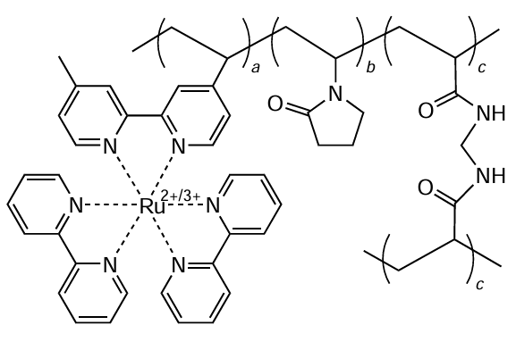The relationship between the amplitude of mechanical oscillations and the rate of response of the polymer gel matrix to the redox transitions of the catalyst was revealed in more recent studies by other researchers.[81][82] Geher – Herczegh et al.[81] synthesized gel 8 (FIg. 7) and showed experimentally that the autonomous mechanical oscillations of the gel had a delay in the swelling (deswelling) response relative to periodic oxidation (reduction) of the catalyst, and the amplitude of chemomechanical oscillations followed an inverse dependence on the duration of this delay. Gel 8 was obtained by immobilizing the bis(2,2'-bipyridine)(1-(4'-methyl-2,2'-bipyridine-4-carbonyloxy)-2,5-pyrrolidinedione)ruthenium(II) catalyst, [Ru(bpy)3-NHS], in the gel presynthesized by copolymerization of IPAAm, MBAAm, and N-(3-aminopropyl)methacrylamide (APMAAm) (see FIg. 7).
