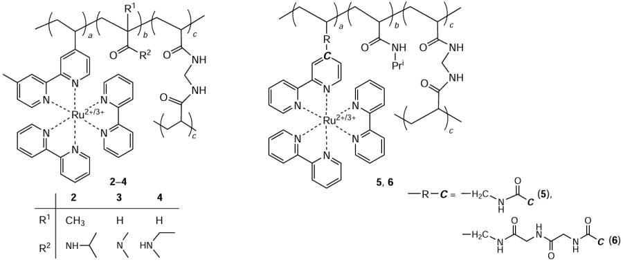 The first representative of this type, gel 1 (Fig. 3),[75] which is also the parent structure for the whole array of autonomous self-oscillating chemomechanical gels, was synthesized in 1996 by Professor Ryo Yoshida’s research group.[40] The authors linked the catalytically active ruthenium(II) complex to the cross-linked poly(N-isopropylacrylamide) matrix. This was done by copolymerization of bis(2,2'-bipyridine)(4-methyl-4'-vinyl-2,2'-bipyridine)rutheium(II) [Ru(vmbpy)(bpy)2] with N-isopropylacrylamide (IPAAm) and N,N'-methylenebis(acrylamide) (MBAAm) in methanol in the presence of azobis(isobutyronitrile) (AIBN) as radical polymerization initiator. The polymerization was carried out at a temperature of 60°C.