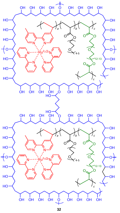 Shrinking of gel 15 in the oxidized state was a contradictory result, because it was expected that an increase in the charge on the Ru(albpy)33+ complex would cause swelling of the gel. Scanning electron microscopy of gel 15 in the reduced and oxidized states confirmed shrinking of the gel upon oxidation of Ru(albpy)3. The authors explained this phenomenon by hypothesizing that the octahedral geometry of the active cross-linker Ru(albpy)3 serves as the joint centre of several polymer chains, which gives rise to dense hyper-cross-linked network in the gel. Since the Ru(albpy)3 moieties are highly restricted in movement inside the hyper-cross-linked network, upon oxidation, the complexes attract additional counter-ions into the network. The influx of counter-ions increases the electrostatic interactions between ions, which expels water molecules from the network and ultimately causes the collapse of the polymer network.