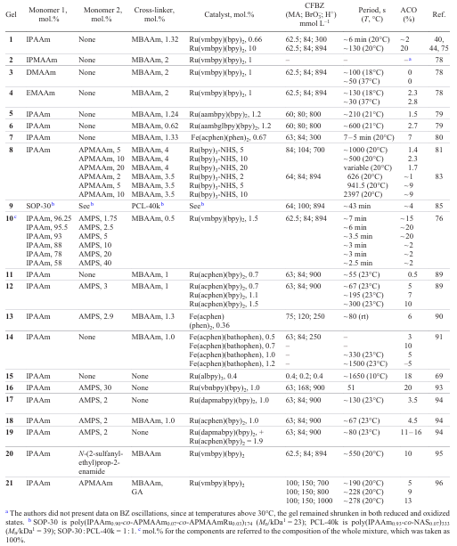 Table 1 presents the compositions of gels 1 – 21 based on cross-linked poly(N-isopropylacrylamide) indicating the names and relative concentrations of the second monomers (monomer 1 concentration was taken as 100 mol.%), cross-linker, and the catalyst; the composition of the CFBZ mixture in which the gels were tested; and the determined periods and maximum amplitudes of chemomechanical oscillations (ACO) at indicated temperatures. It can be seen from the presented data that, despite the almost 30-year history of the development of gels based on cross-linked poly(N-isopropylacrylamide), this line of research can be considered unpromising for practical application, since all such gels exhibit chemomechanical oscillations only within a limited temperature range; show minor swelling – deswelling amplitudes (changes in the linear dimension) of up 20%; and operate at frequencies of the order of hundredths of Hertz.