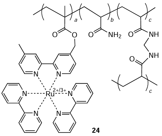 Yuan et al.[66] obtained gel 24 by photocopolymerization of the bis(2,2'-bipyridine)(4-methacryloylmethyl-4'-methyl-2,2'-bipyridine)ruthenium(II) catalyst [Ru(mpmbpy)(bpy)2] with AAm and MBAAm in the presence of 2-hydroxy-2-methyl-1-phenylpropan-1-one as the initiator. The immersion of a 2.0 × 0.65 × 0.02 mm slab of gel 24 in a CFBZ solution resulted in the generation and propagation of chemical waves caused by periodic catalyst oxidation and inducing shrinking of the gel as the propagated; the observed decrease in the slab width was approximately 11%. When the catalyst was reduced, the width of the slab increased to the original values. The authors suggested that the increase in the charge on the catalyst upon oxidation could lead to a stronger association of the catalyst with polar groups in the gel side chains. These associations, that is, reversible cross-links that are formed only when the catalyst is in the oxidized state and, correspondingly, are broken when the catalyst is reduced, generate osmotic pressure that expels water from the polymer matrix and, consequently, led to gel shrinking upon the catalyst oxidation.