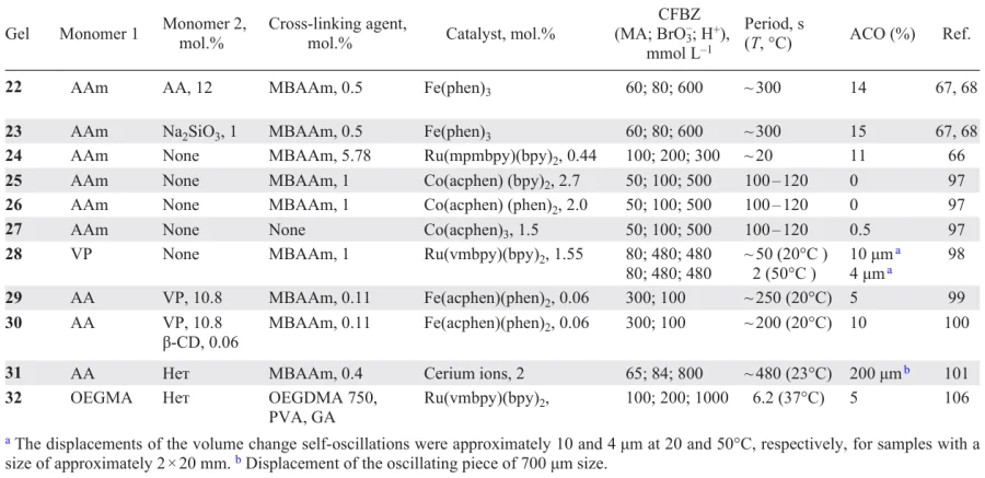 Table 2 summarizes the compositions of gels 22 – 32, indicating the names and relative concentrations of the second monomer (the concentration of monomer 1 was taken as 100 mol.%), cross-linkers, and the catalysts; composition of the CFBZ mixture in which the gels were tested; and the determined periods and maximum amplitudes of chemomechanical oscillations at the indicated temperatures.