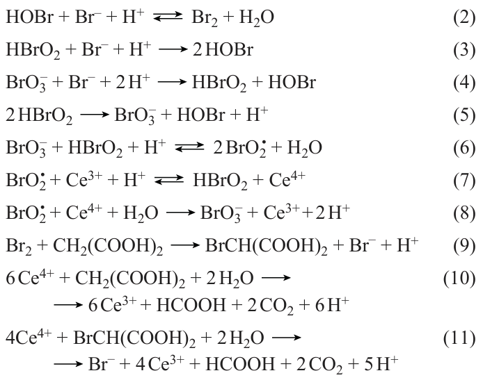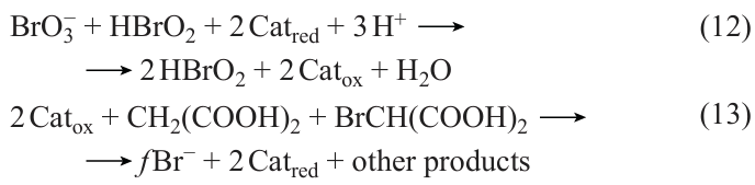 According to the Field – Körös – Noyes mechanism, reactions in which oxidation and reduction of the catalyst occur can be represented as processes (12) and (13), respectively.[54][60-62]