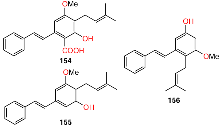 Apart from trans-stilbene and resveratrol, other natural stilbenes were also found to exhibit anti-hemolytic and anti-biofilm activity against various S. aureus. Particularly, cajaninstilbene acid (154), longistylin A (155), and longistylin C (156) isolated by Li et al.[110] from the leaves of pigeon pea (Cajanus cajan). The attention of the authors was attracted by the plant itself, as it was repeatedly mentioned in the literature that longistylin A and its derivatives are the main components of aqueous ethanol extracts of pigeon pea leaves[111][112] and anti-MRSA activity of this compound has been reported.[113]