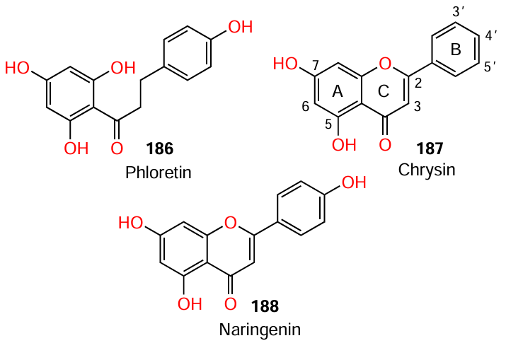 Paczkowski et al.[121] used phloretin (186), chrysin (187), and naringenin (188) to demonstrate the action of flavones as non-competitive inhibitors of LasR and RhlR. The authors found that each of the three flavonoids has two hydroxyl substituents in positions 5 and 7 of ring A. However, unlike compounds 187 and 188, the first-mentioned compound 186 does not have a rigid structure provided by a chromanone or chromenone ring C.