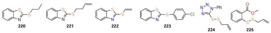 (1) the presence of a disulfide group is an important factor for the quorum sensing inhibitory activity (compounds 220 – 225 proved to be inactive);