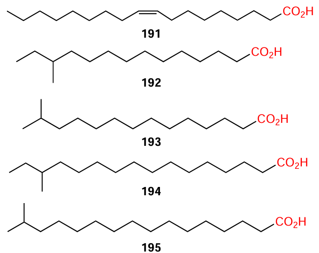 Plants represent a major source of fatty acids, both saturated and (poly)unsaturated ones.[123] For example, industrially valuable safflower oil (Carthamus tinctorius L.) is rich in oleic acid (> 75% of the oil composition).[124] Branched saturated acids, which are most similar to bacterial DSFs, although previously traditionally considered to be of only animal or bacterial origin, have also been found in plants.[125-127] The effect of certain acids with long aliphatic chains (e.g., compounds 191 – 195) on biofilm formation in S. aureus and P. aeruginosa bacteria was studied.[121]