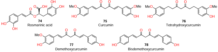 Curcuminoids, secondary metabolites of the turmeric plant (Curcuma longa L.) are widely used as food colorants due to their bright yellow colour. A known AHL mimic is rosmarinic acid (74), a functional analogues of C4-AHL.[98][99] Some authors noted[6][98] that structural analogues of rosmarinic acid, i.e., linear compounds with aromatic groups at the ends of the molecule, also mimic AHL and, hence, inhibit QS.